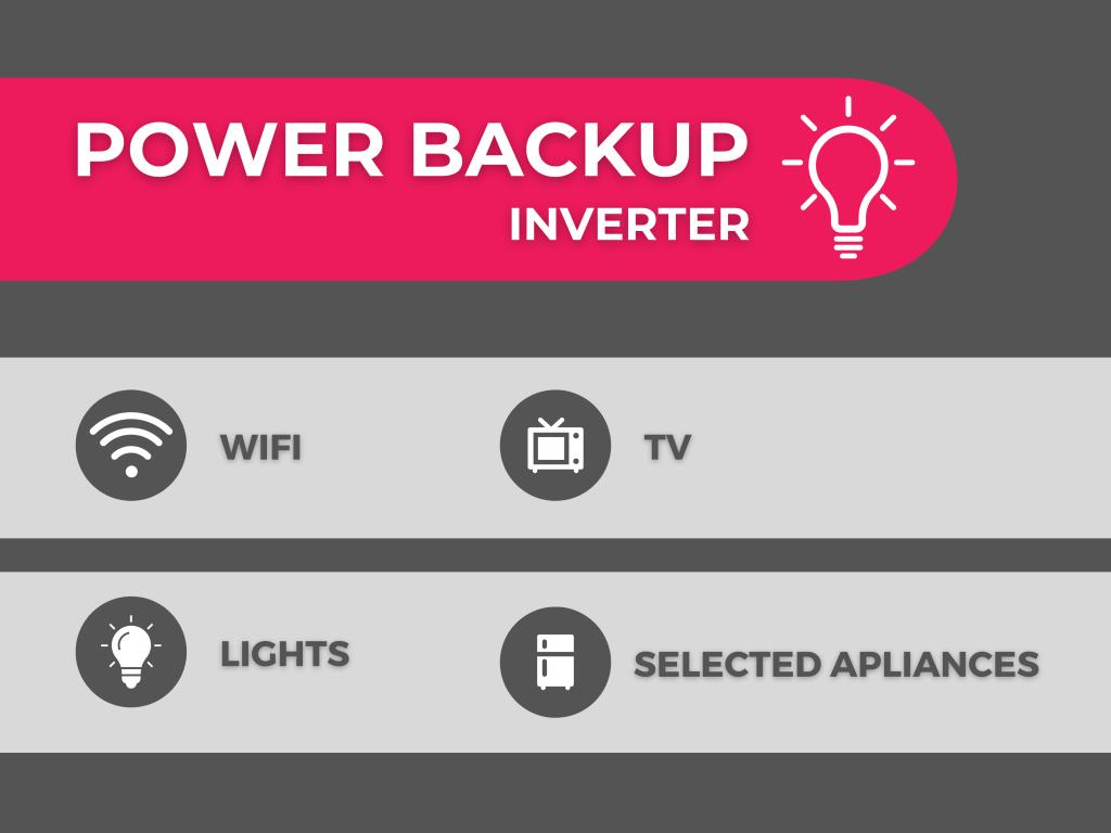 - Power Backup, Inverter (Wifi, TV, Lights and selected power outlets)