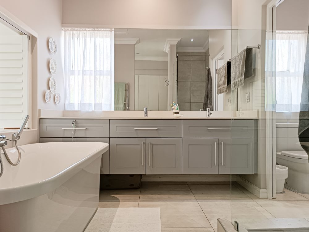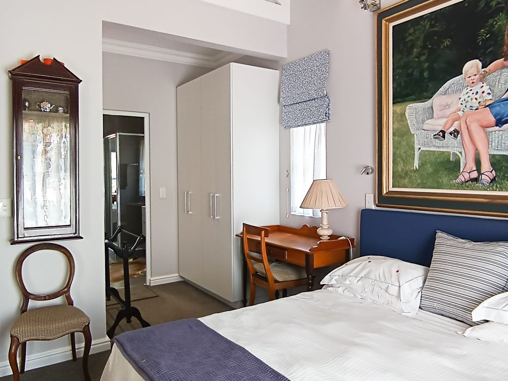BEDROOM 1: King en suite bathroom (open plan bath with hand-shower, separate shower & enclosed toilet). Opening into garden & fitted with standard TV connected to DStv.