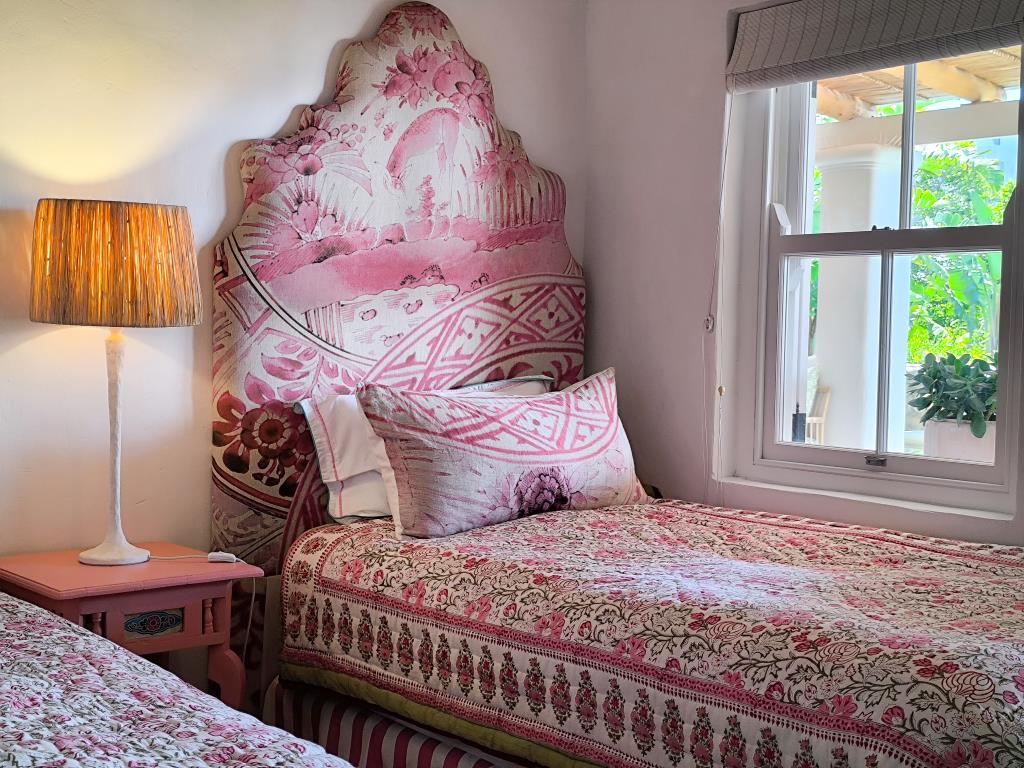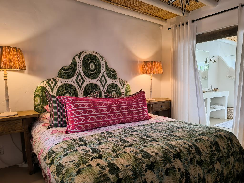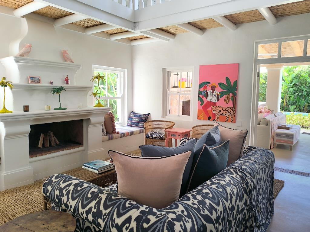 French doors open to the expansive patio that stretches the length of the house, offering an outdoor fireplace, comfortable lounge seating, and a dining area that can comfortably accommodate ten. Vibrant prints and rich textures add a touch of bohemian charm throughout. Cool off in the refreshing splash pool or soak up the sun on the sun deck, complete with a firepit for cozy evenings under the stars.