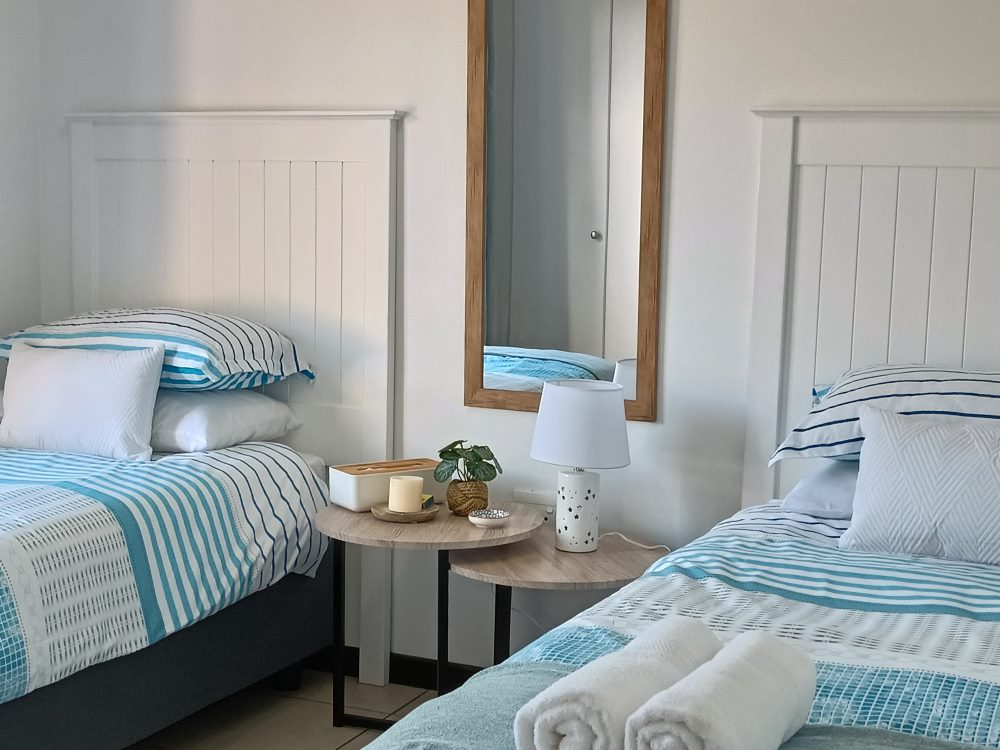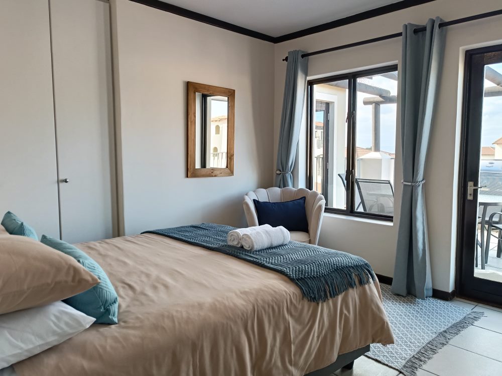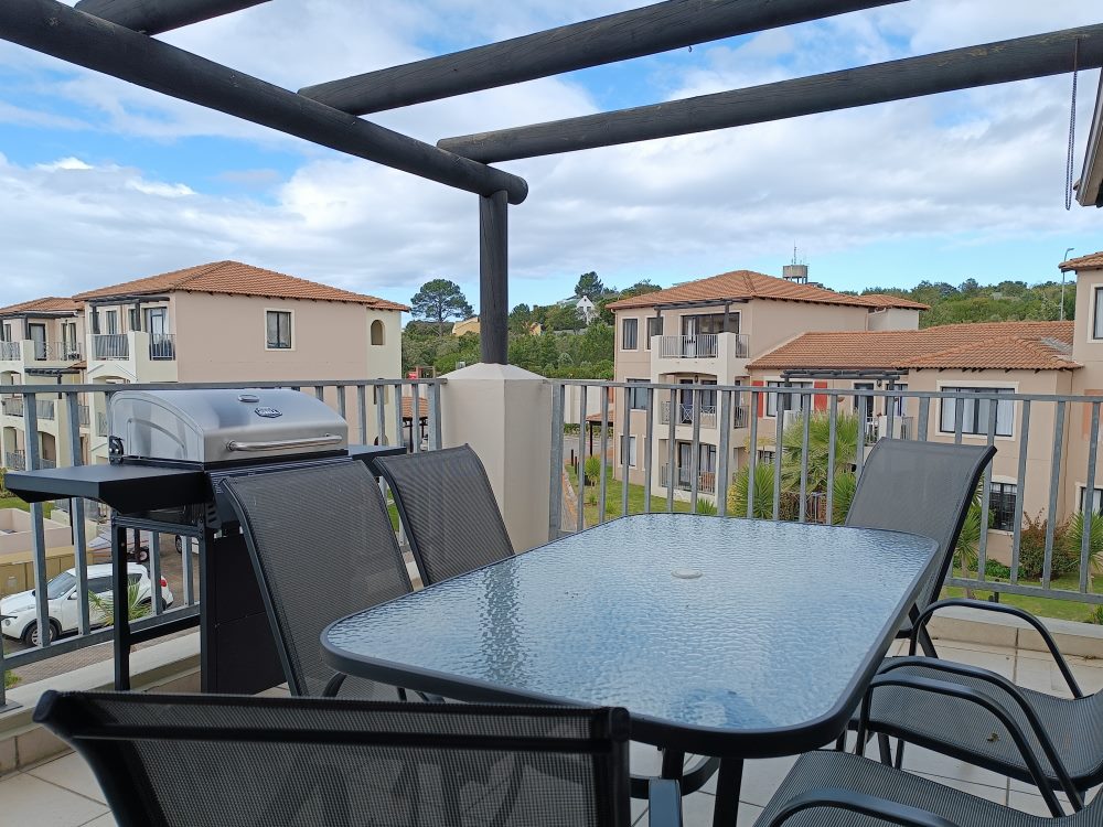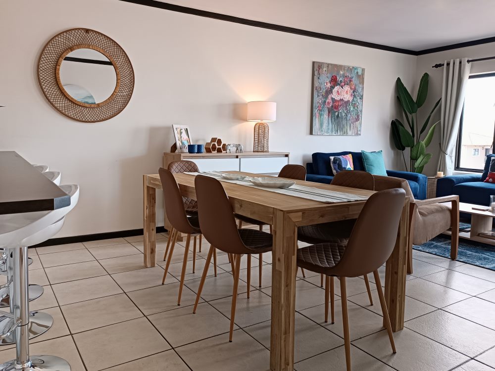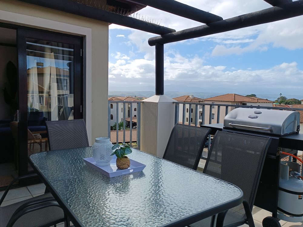Fully remodeled (May 2023) top floor apartment in the gated Santini Village complex offering fussy-free accommodation with a unique style of minimalism meets retro. Santini Village is located in upper town approx. 2 km from town and blue flag status Lookout Beach and approx 3 km to Central Beach. Open plan living area featuring chic 6-seater dining space, comfy lounge fitted with smart TV and well equipped kitchen enjoying 4-seater countertop. Living area opens onto sunny balcony fitted with 6-seater outdoor dining, large gas braai and umbrella for those summer days.