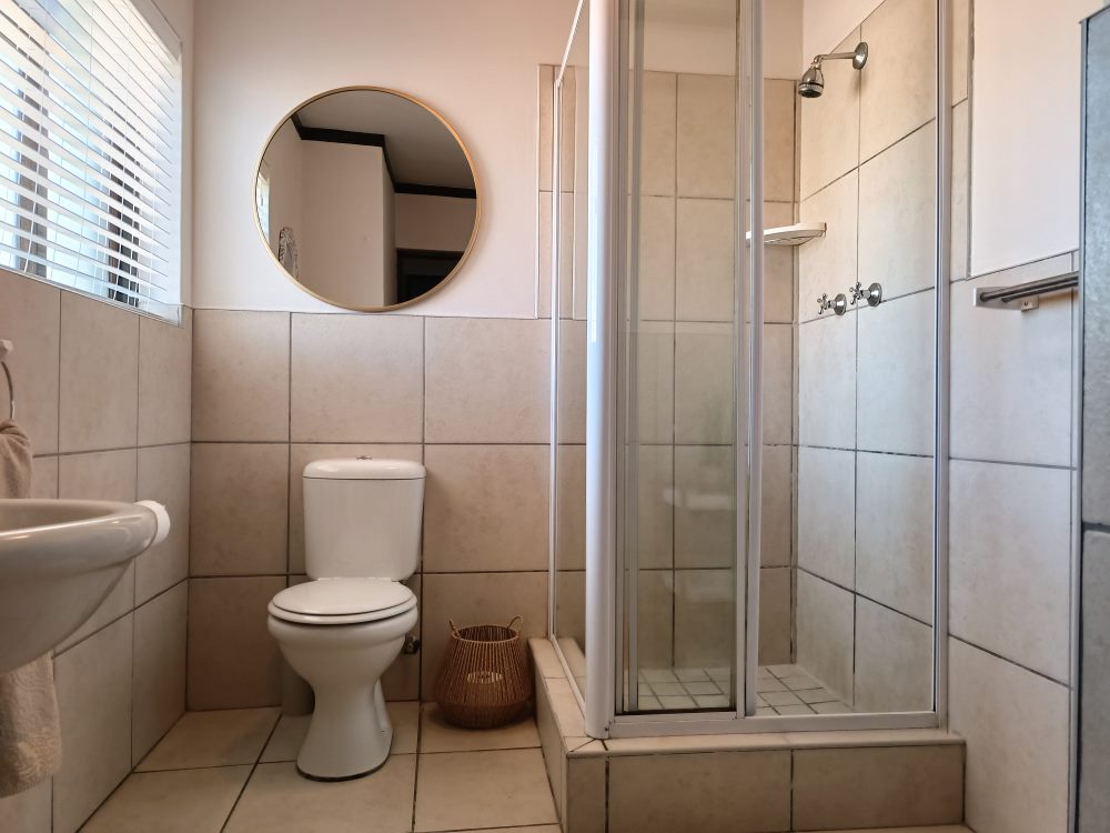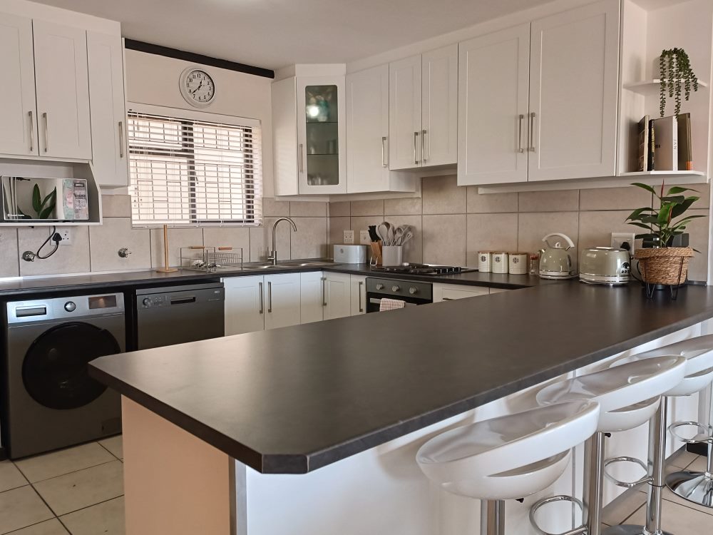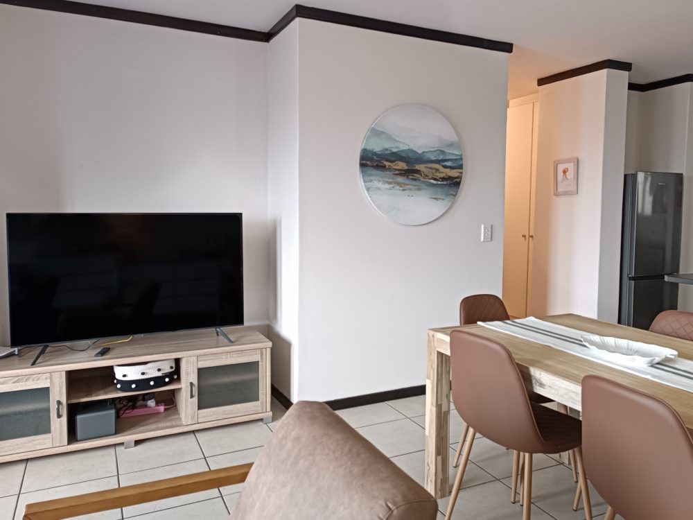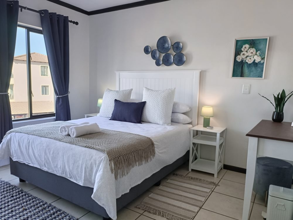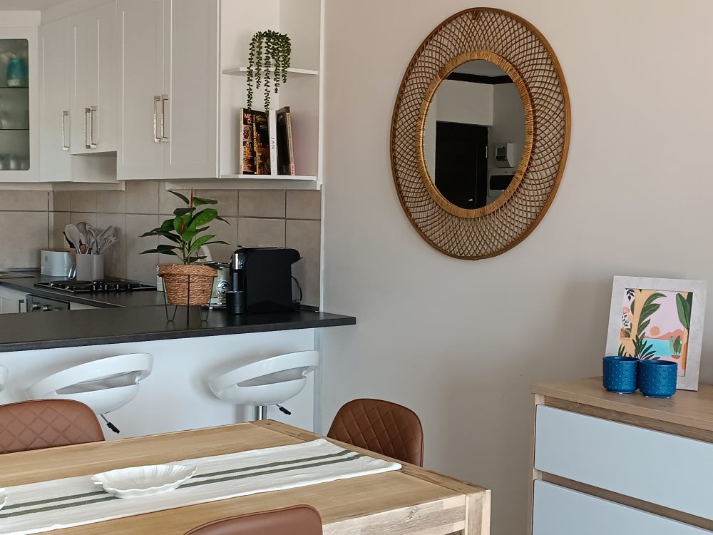 Fully remodeled (May 2023) top floor apartment in the gated Santini Village complex offering fussy-free accommodation with a unique style of minimalism meets retro. Santini Village is located in upper town approx. 2 km from town and blue flag status Lookout Beach and approx 3 km to Central Beach. Open plan living area featuring chic 6-seater dining space, comfy lounge fitted with smart TV and well equipped kitchen enjoying 4-seater countertop. Living area opens onto sunny balcony fitted with 6-seater outdoor dining, large gas braai and umbrella for those summer days.