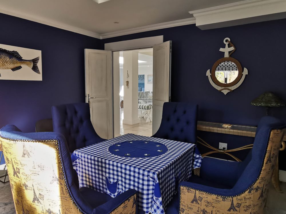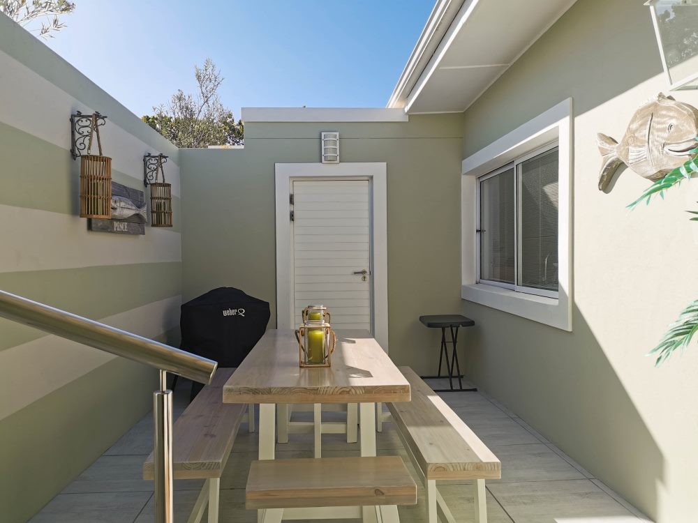 At the entrance to the house is another seating area which is protected from the wind fitted with outdoor seating and portable braai & heater for those chiller days and nights.