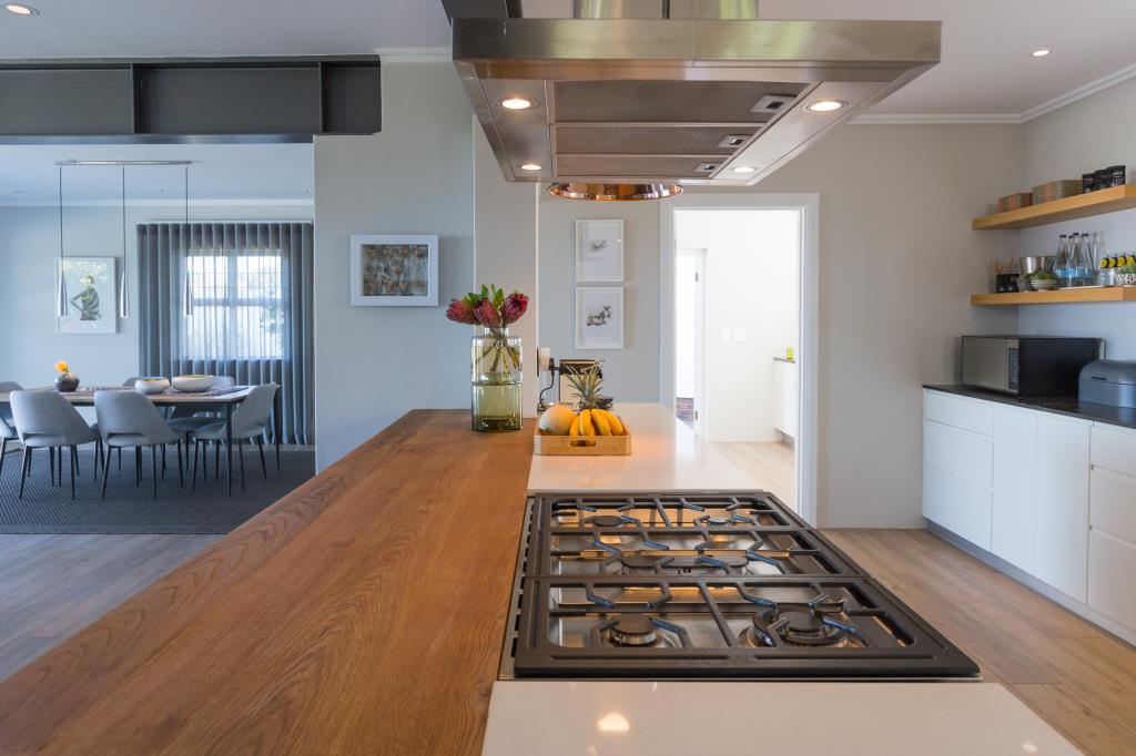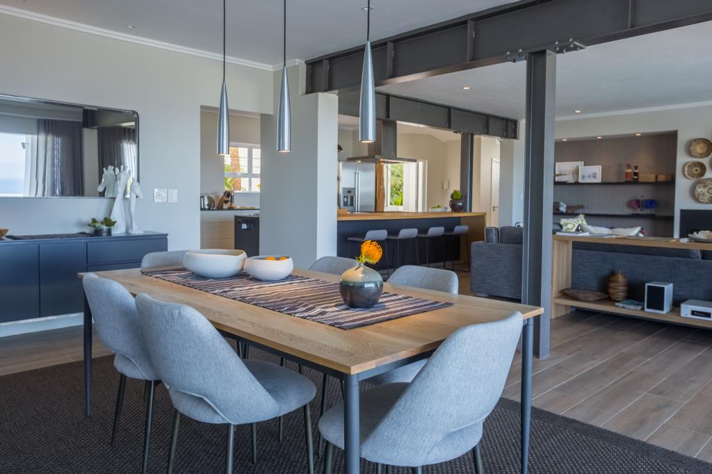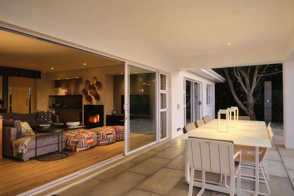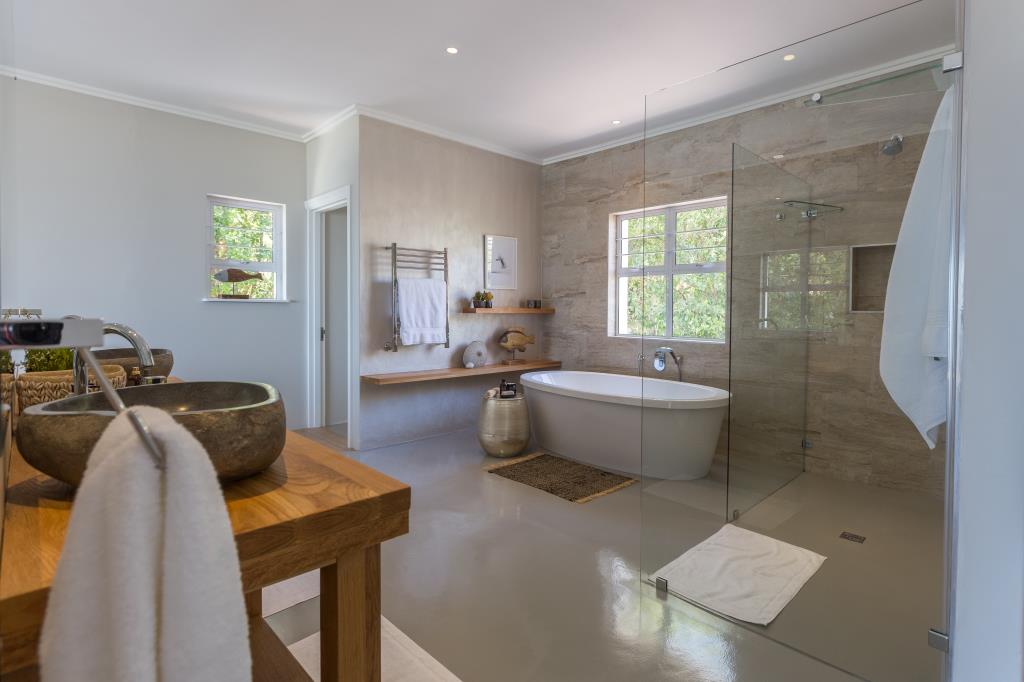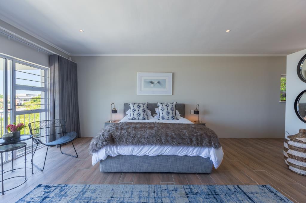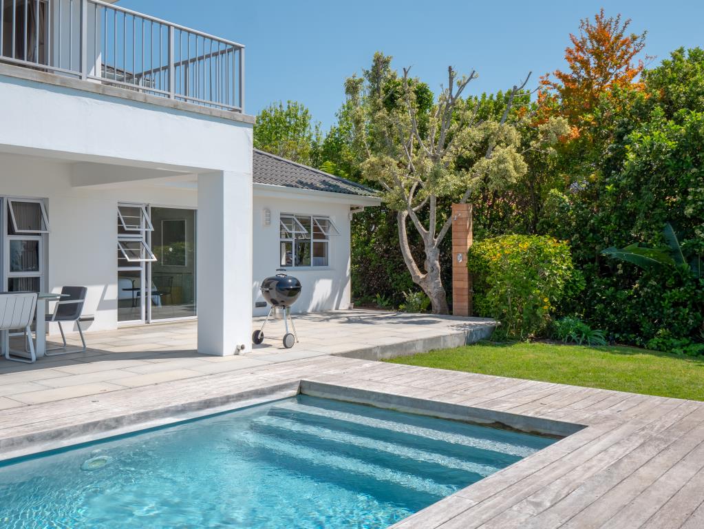 Up market, fenced-in, very spacious double storey house with swimming pool. DOWNSTAIRS houses the open plan lounge (wood fire-place), kitchen (with inter-leading scullery) and dining area with large glass sliding doors opening onto covered deck overlooking pool, garden, enjoying views. En suite bedroom 1 and guest washroom. UPSTAIRS: 2 en suite bedrooms, both opening onto semi-covered balcony with views.