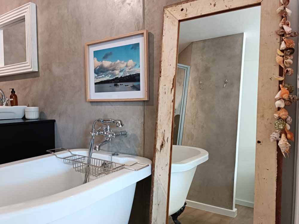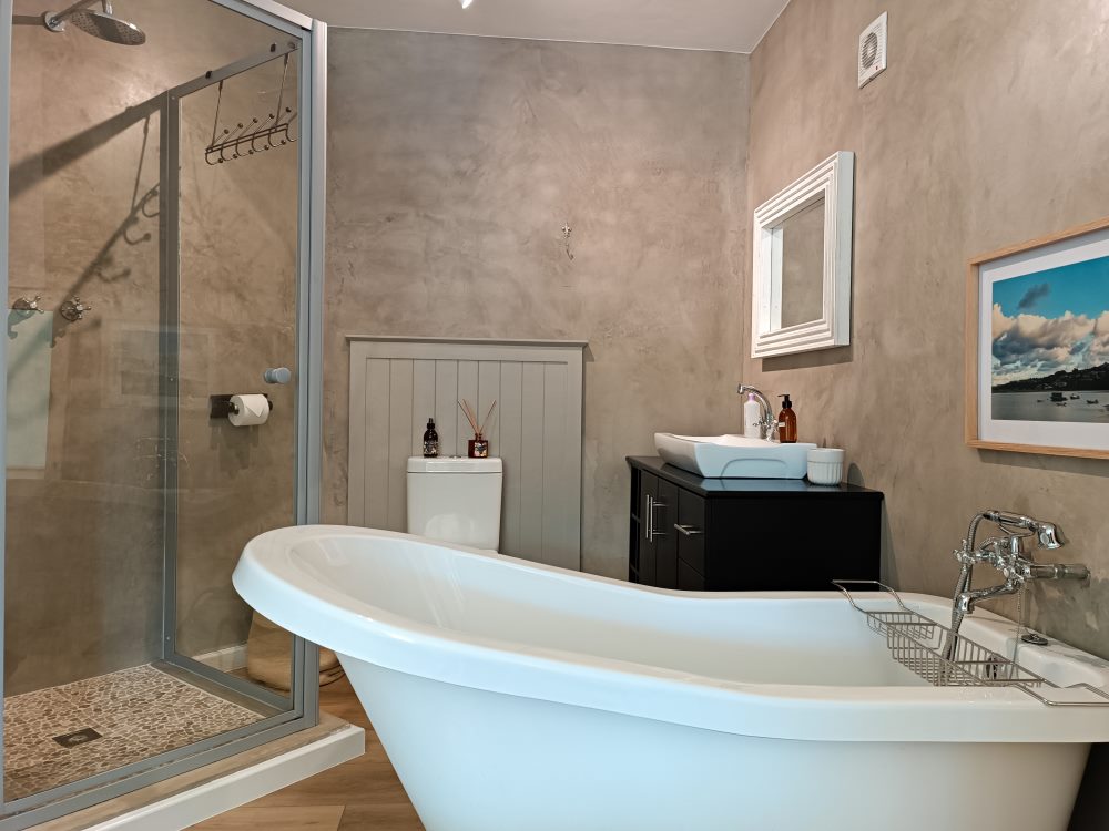 BEDROOM 1: King with open plan bathroom (Victorian bath, shower & toilet).