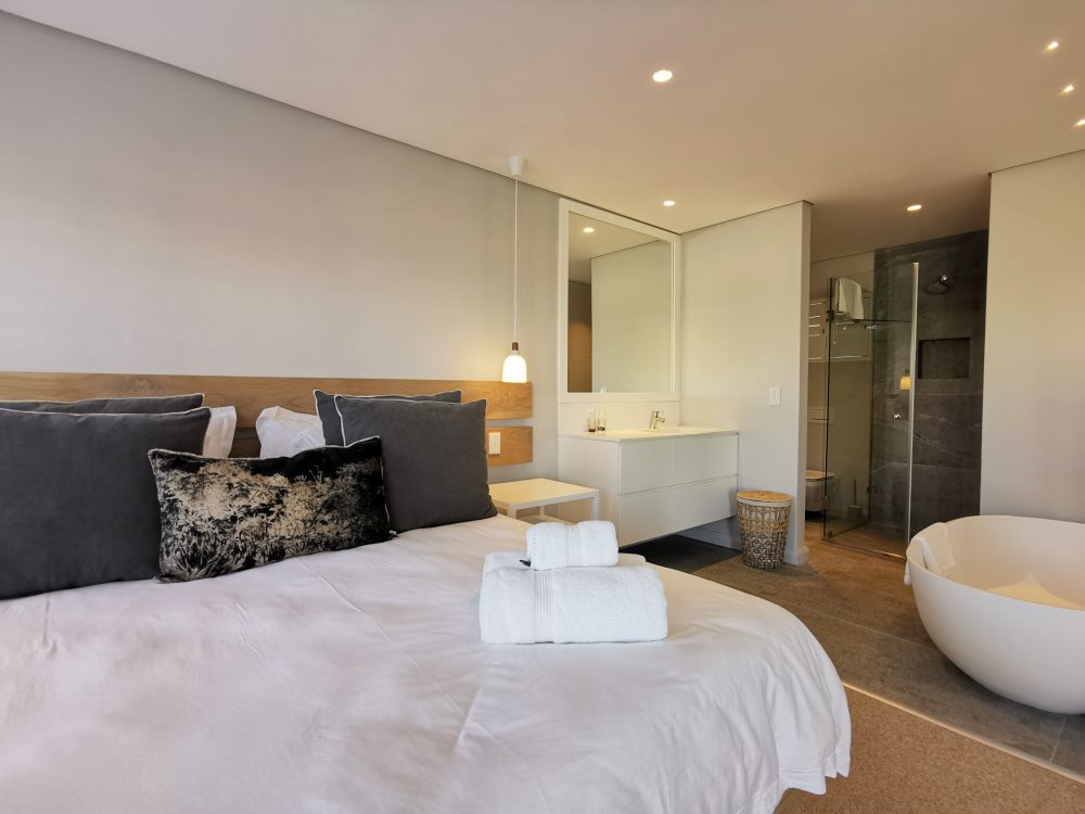 From the upstairs living area guests can access the rooftop deck encompassing views of the sea, sea, sea...beach, mountain ranges and Plett residential area including green belt...ideal for sundowners and sun-seekers. The living area features generous open-plan kitchen and seating area flowing out onto patio with views views views, ideal for entertaining and Al-Fresco living. Separate TV & lounge area fitted with dining-table enjoying natural sunlight and space. All bedrooms are downstairs and en suite.