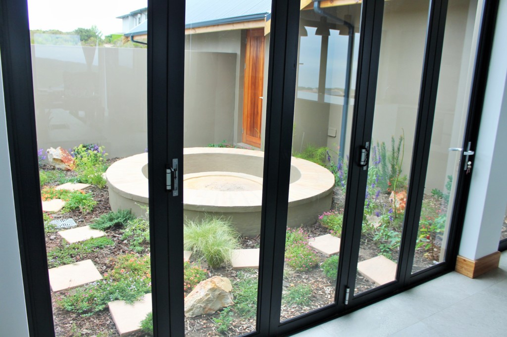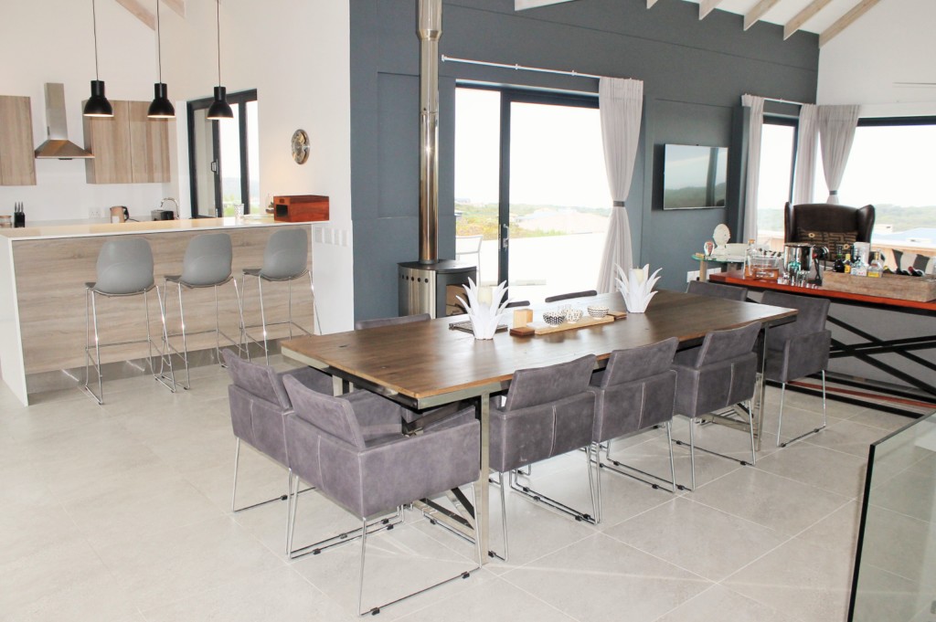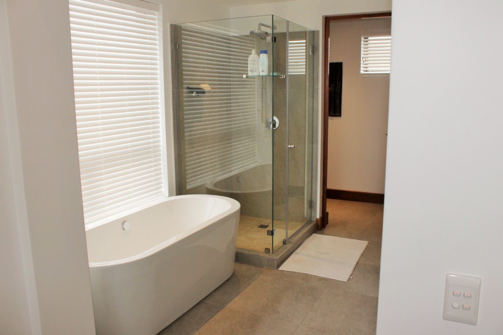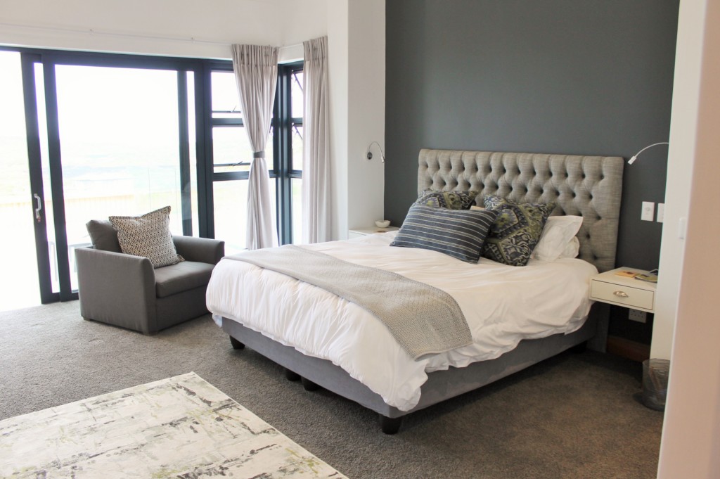 This home offers well equipped accommodation defined by a sense of minimalism with functionality and ultra-clean lines. STREET level: The glass enclosed top section houses the open plan lounge (fitted with TV & wood fire-place), kitchen (inter-leading scullery) and dining area (10-seater table) allowing for views, views, and views. Living area opens onto deck with rim-flow swimming pool and inviting outside entertainment area fitted with loungers ideal for soaking up the sun. Cosy enclosed manicured garden fitted with fire/braai pit. Main en suite bedroom (#1).