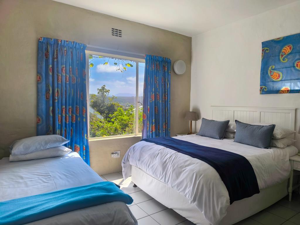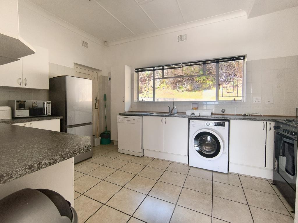This older but comfortable, double-story family home is situated in a quiet cul-de-sac with wonderful sea views. The main living area is on the upper level, along with a separate kitchen equipped with a gas stove and an extra fridge. The inter-leading lounge and dining room open onto a sunny balcony, which offers beautiful views of the sea, lagoon, and mountains. The upper level also has two bedrooms and one bathroom. The remaining bedrooms are on the ground floor.
