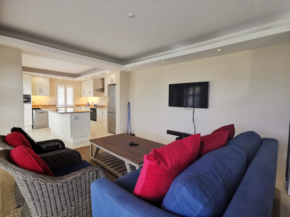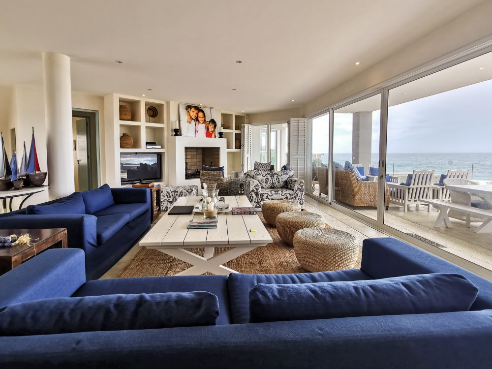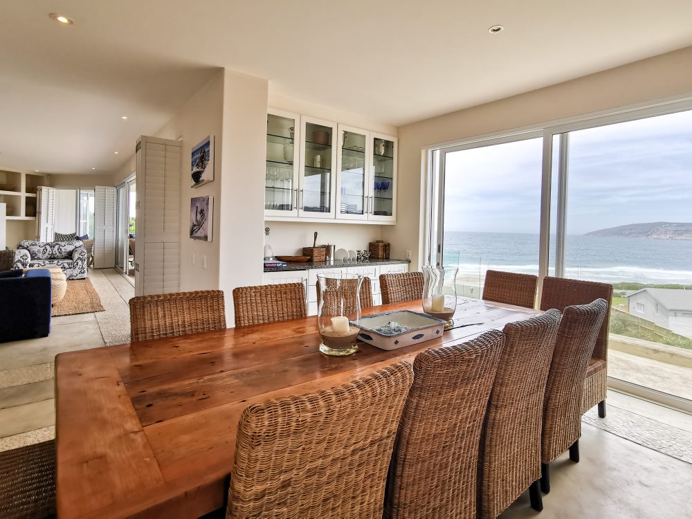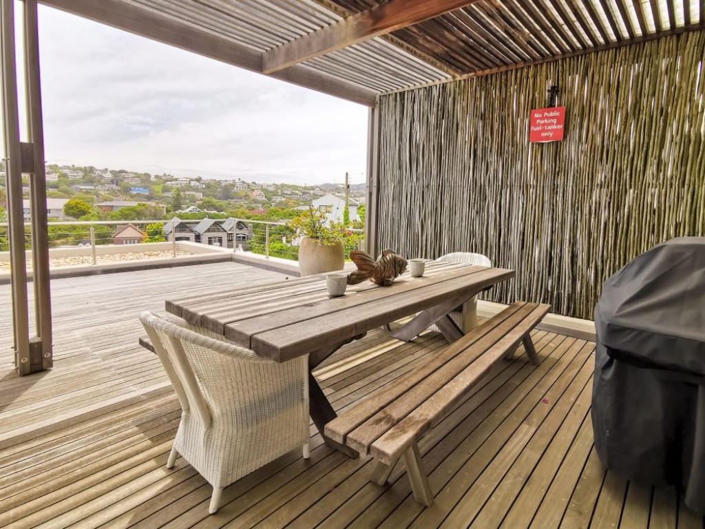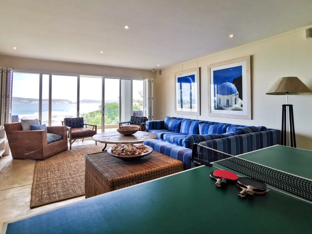 Middle level offers large living area with lounge fitted with wood fire-place, kitchen and dining spaces including the 4th en suite bedroom with separate guest toilet. Living area opens onto 2 separate patio areas, the front overlooking the ocean and Robberg Nature Reserve and fitted with built-in braai.