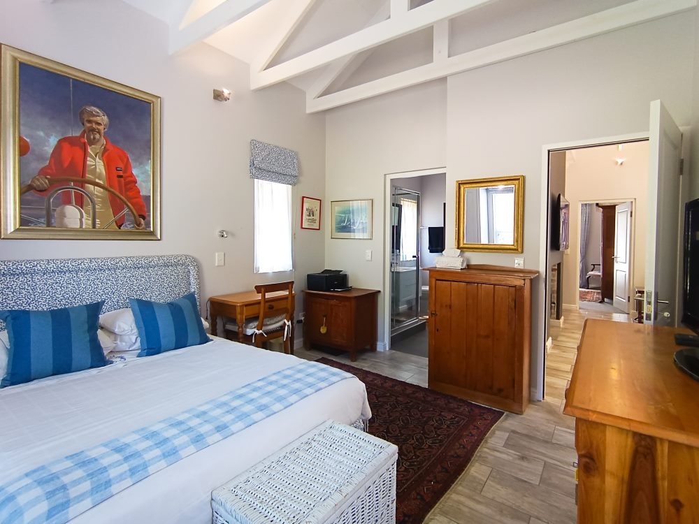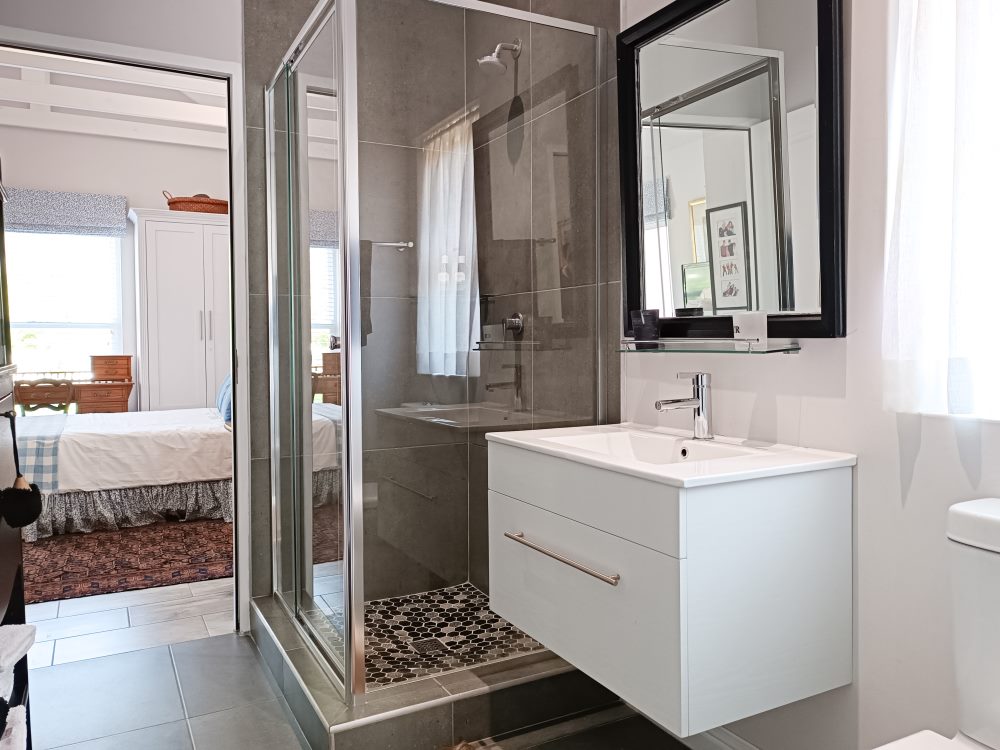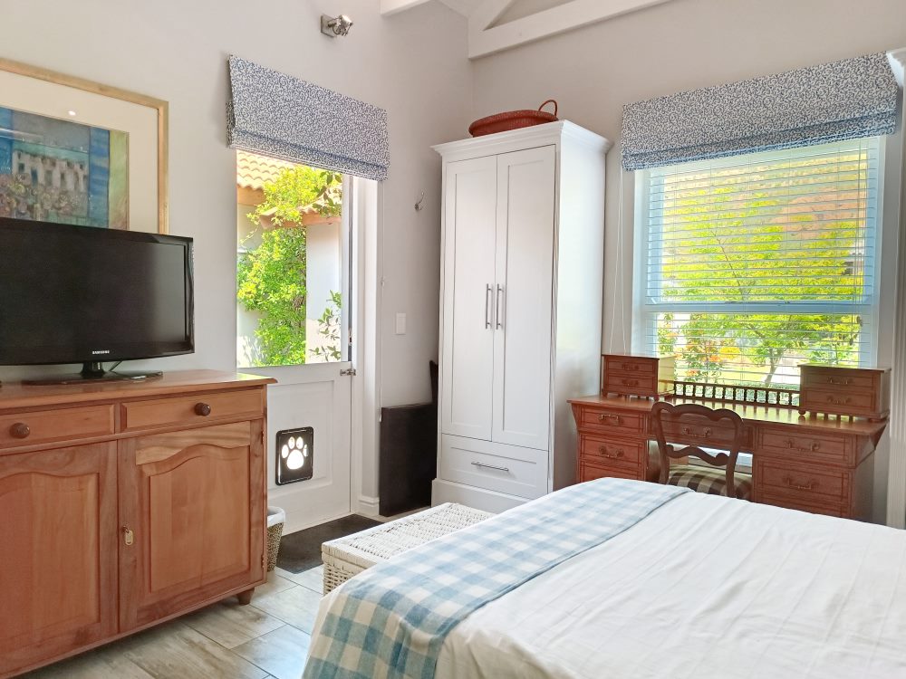 BEDROOM 1: King en suite bathroom (open plan bath with hand-shower, separate shower & enclosed toilet). Opening into garden & fitted with standard TV connected to DStv.