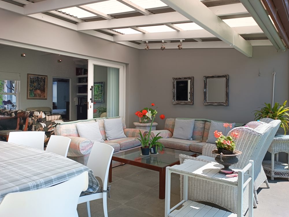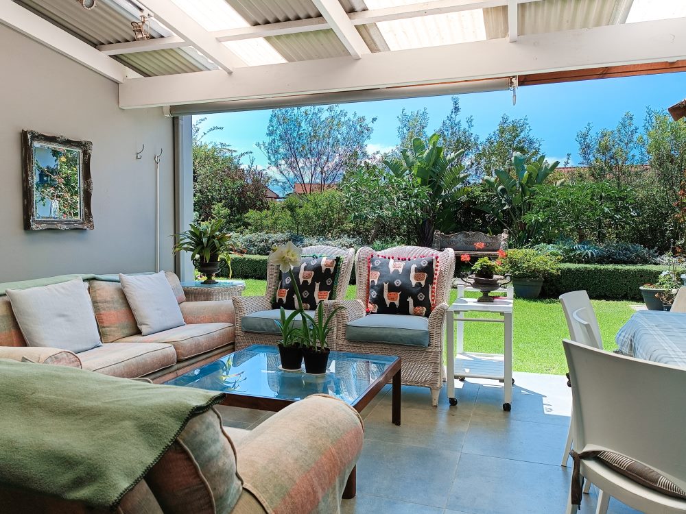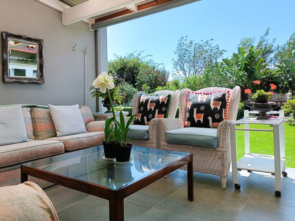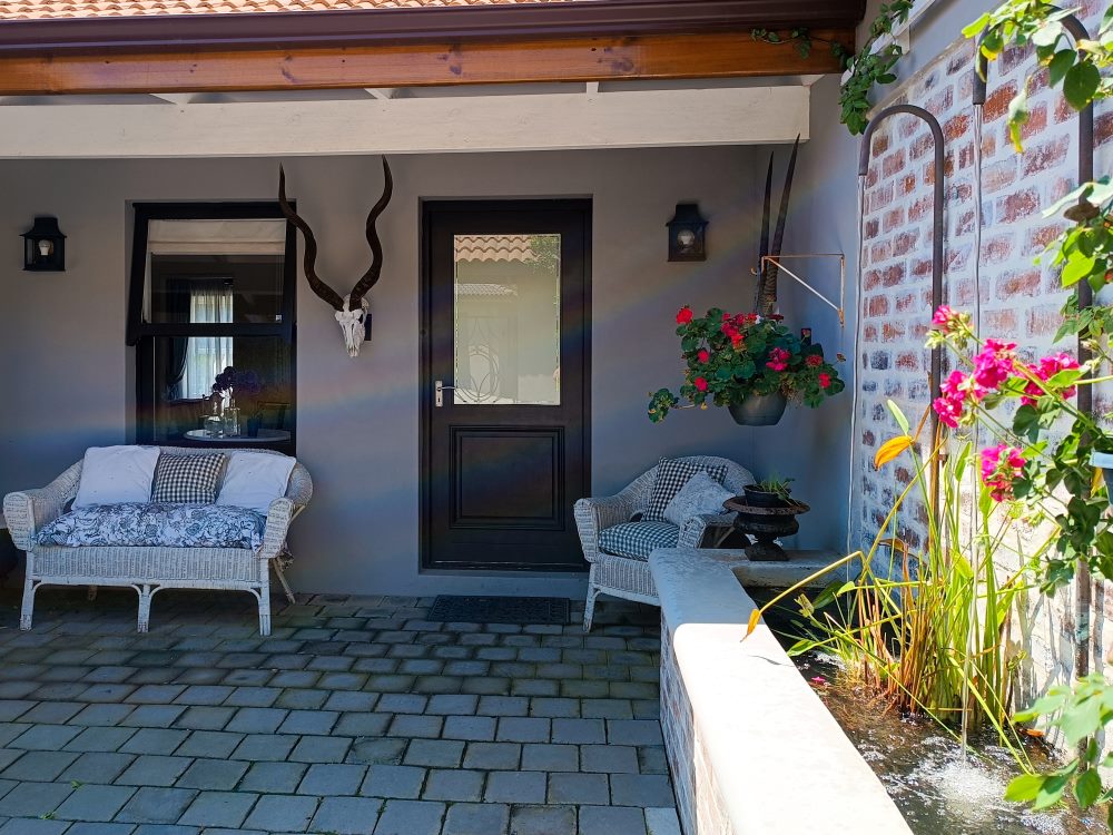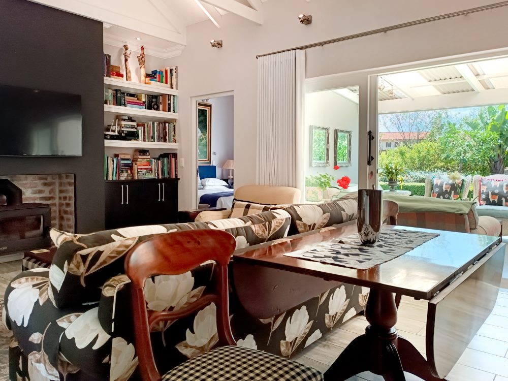 Entrance features tranquil fountain opening into open-plan living space with a lounge enjoying a wood-burning fire-place, kitchen and dining area (6-seater). Living area flows out onto sunny covered patio, furnished for the ideal outdoor dining experience leading into private manicured garden.