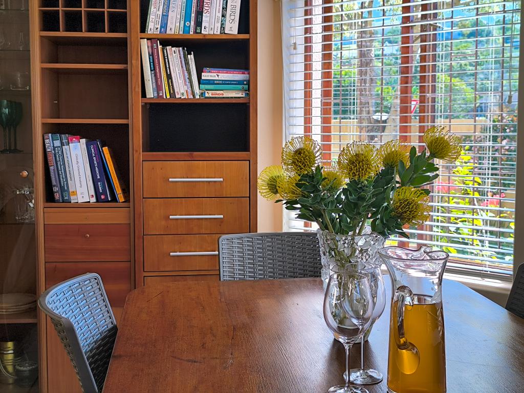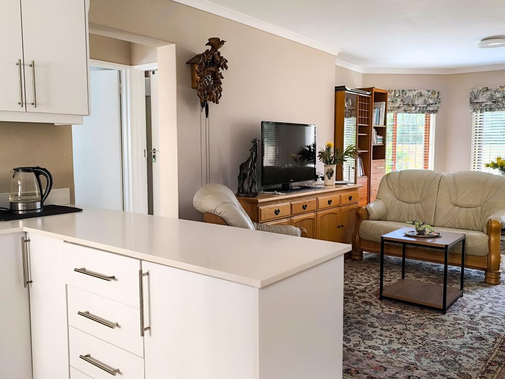 This open-plan apartment offers a cozy living space with a comfortable lounge featuring a TV, a dining area for four, and a fully equipped kitchen. The living area opens onto a shared garden, providing a tranquil outdoor space. Perfect for a convenient and comfortable stay.