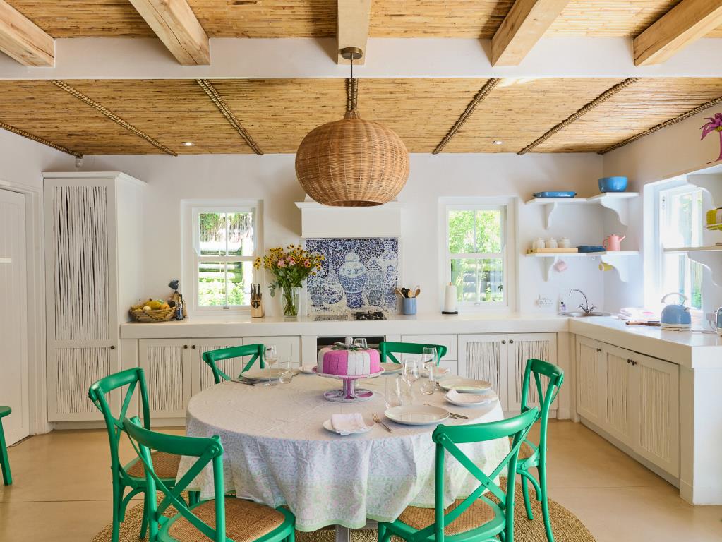 French doors open to the expansive patio that stretches the length of the house, offering an outdoor fireplace, comfortable lounge seating, and a dining area that can comfortably accommodate ten. Vibrant prints and rich textures add a touch of bohemian charm throughout. Cool off in the refreshing splash pool or soak up the sun on the sun deck, complete with a firepit for cozy evenings under the stars.