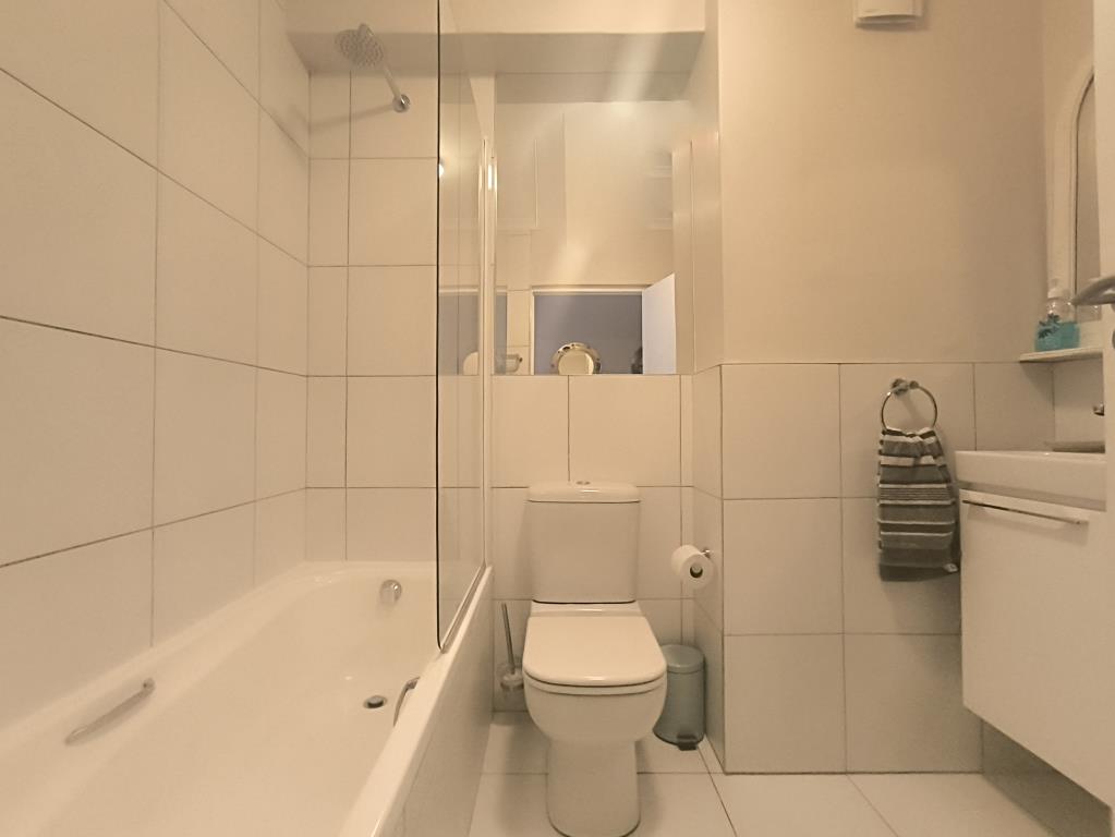 FAMILY BATHROOM: Toilet, bath with overhead shower.