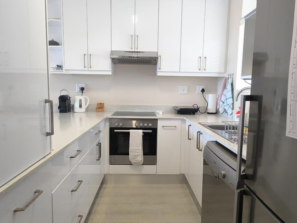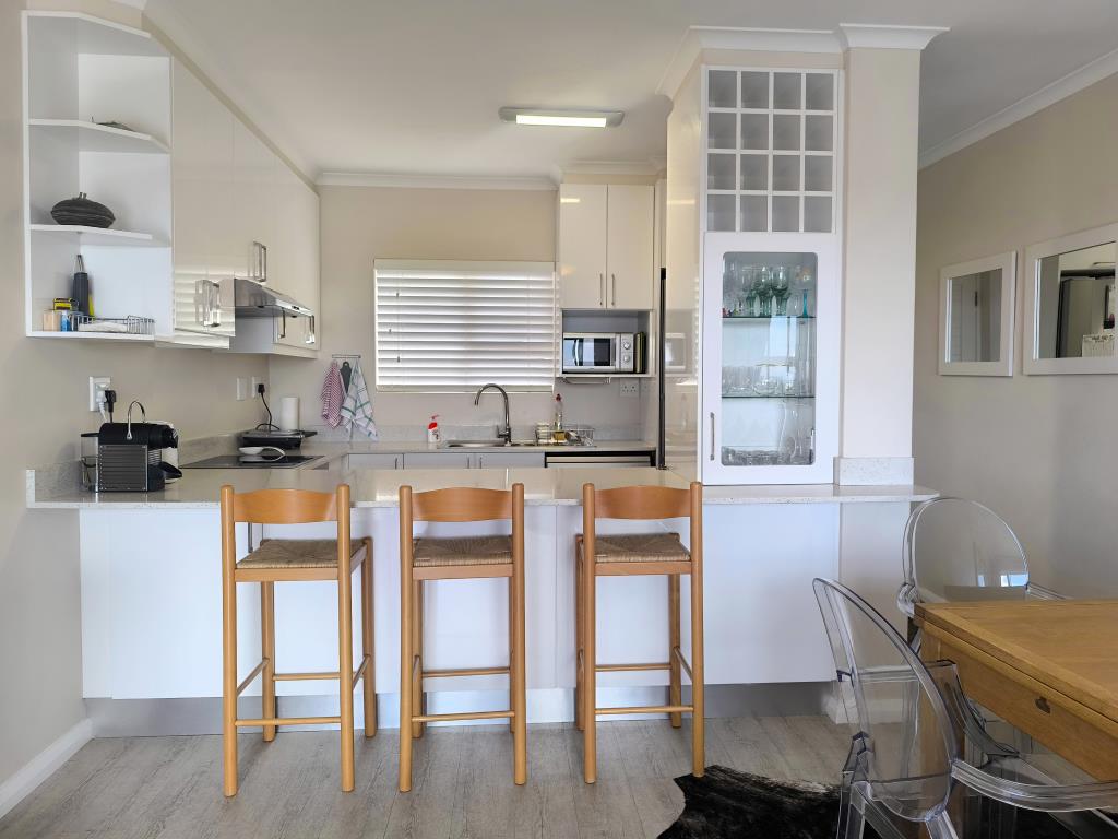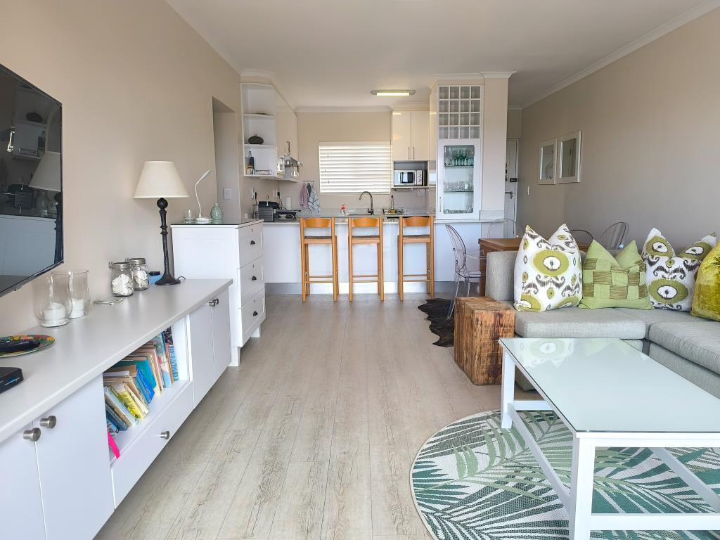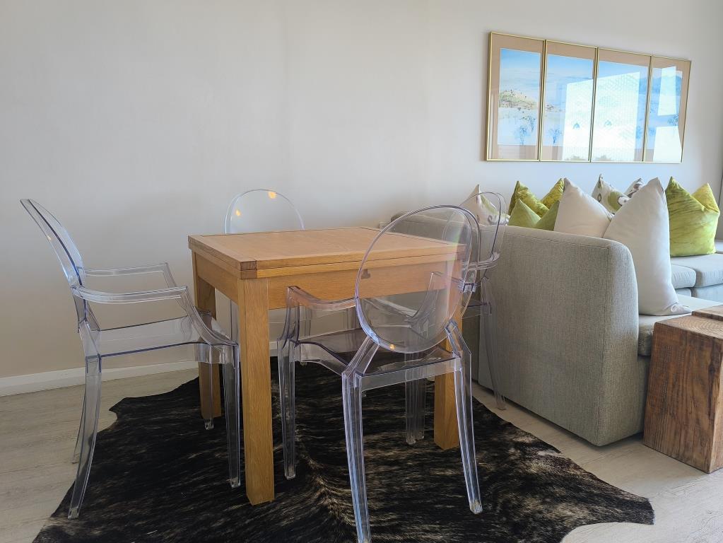 The open-plan living space, featuring a well-equipped kitchen, lounge, and dining area (seats 4), seamlessly connects to a sunny patio offering tranquil sea, mountain, and lagoon vistas.