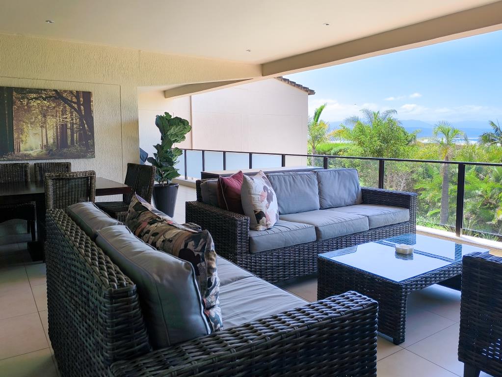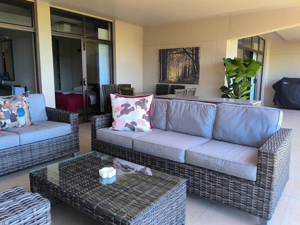 The open-plan living area encompasses a comfortable lounge, a dining room with seating for eight, and a well-equipped kitchen and scullery. A spacious, covered balcony extends the living space, offering a lounge area, an outdoor dining setup with a gas grill, and pleasant views.