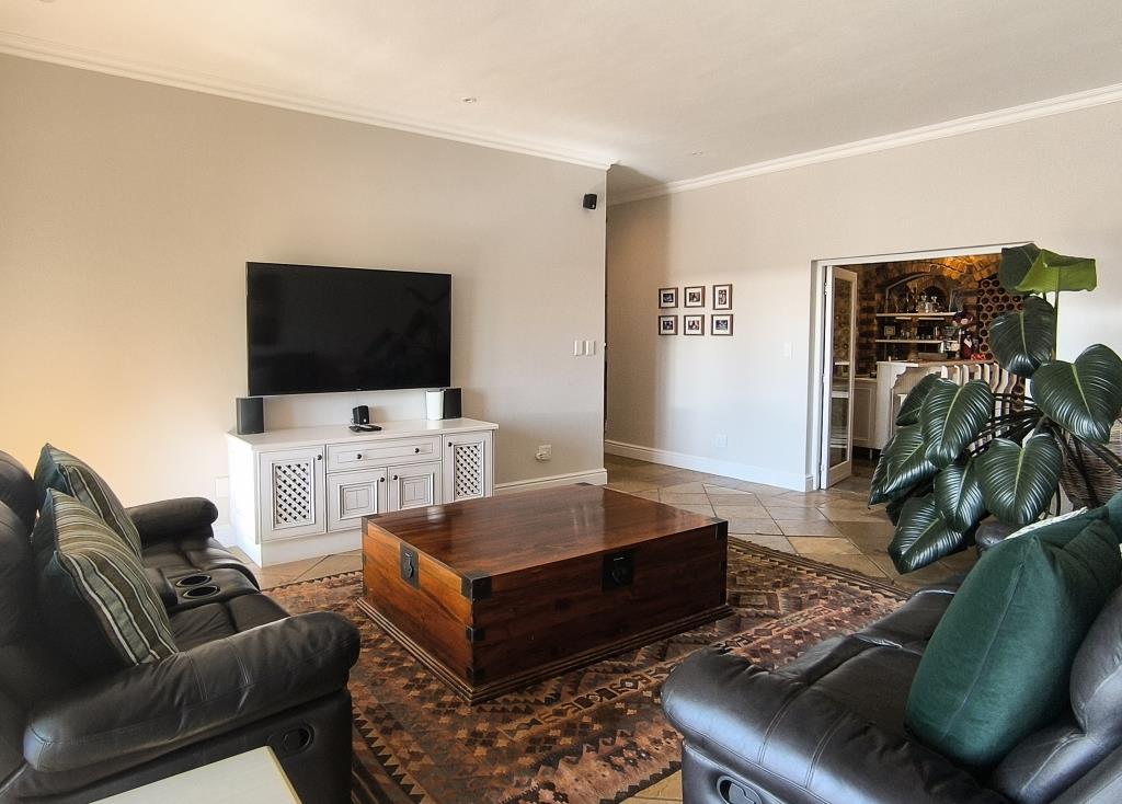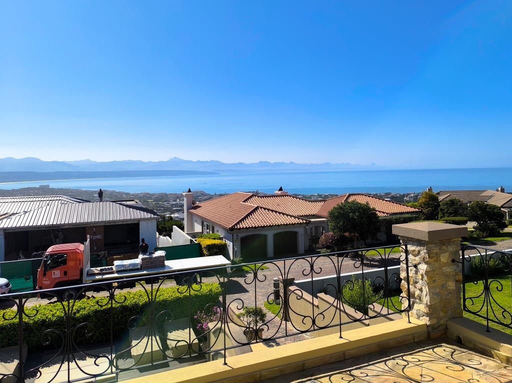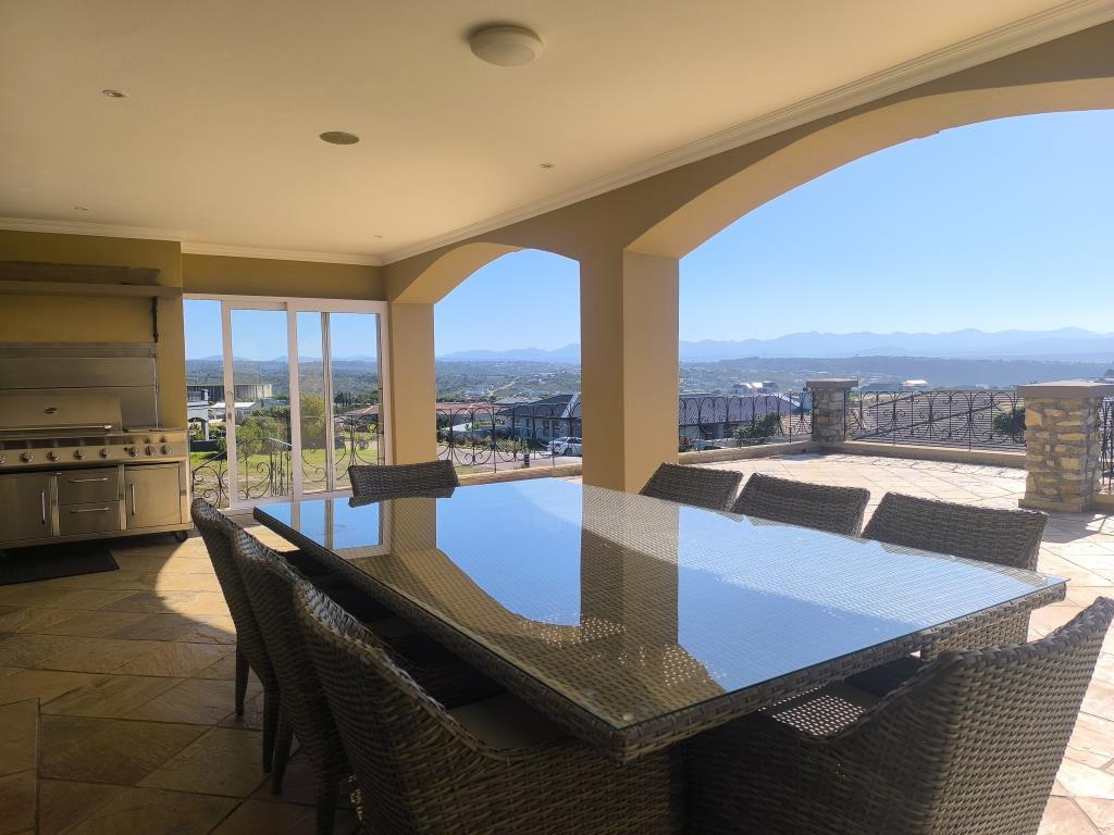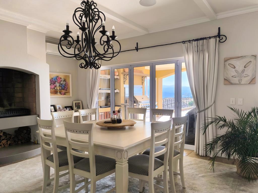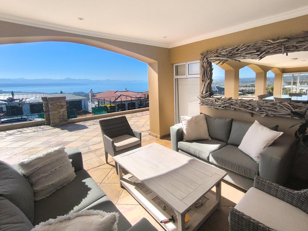 Step into the main open-plan living area, featuring a comfortable lounge, an 8-seater dining space with a cozy fireplace, and a generous country-style kitchen complete with a separate scullery. This inviting area flows seamlessly onto an expansive, full-length patio. Here, youll find the braai, outdoor dining set, and a lounge area, all enjoying breathtaking panoramic views of the Plettenberg Bay coastline. A private home office is also available for those who need to work remotely.